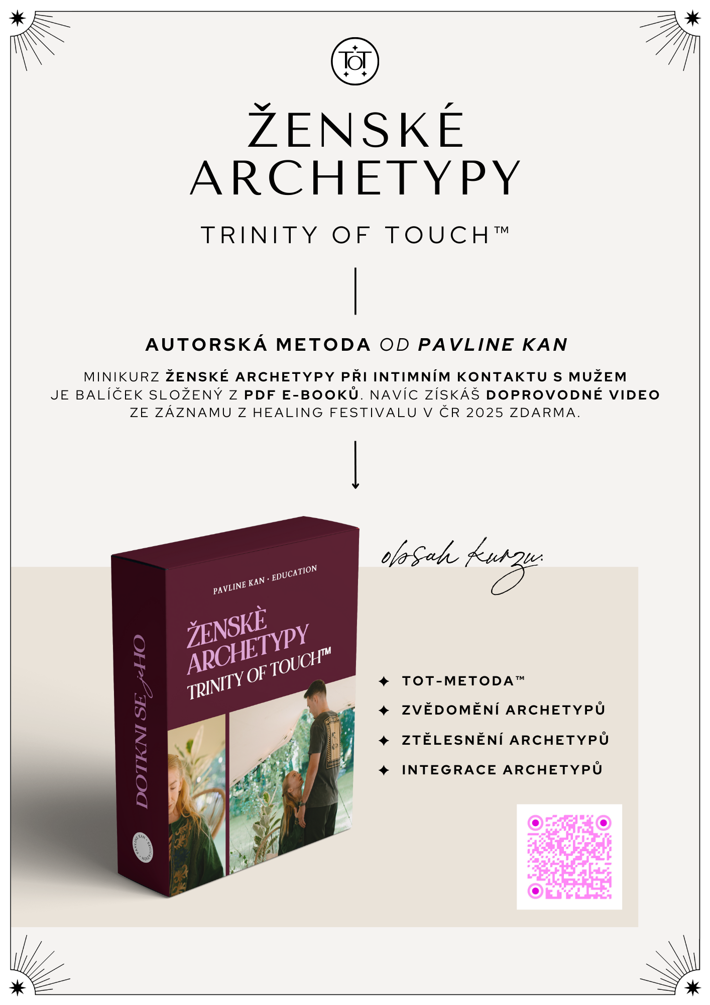 Tento mini online kurz vznikl na základě živého setkání na Healing Festivalu 2025 v České republice a nyní ho můžeš zažít v rozšířené verzi z pohodlí domova. Přináší nejen samotný záznam, ale také rozšířený obsah pro hlubší integraci a domácí praxi. Obsahuje 90minutové video ze záznamu z workshopu z Healing Festivalu, pečlivě zpracované a krásné PDF materiály určené k tisku: MANUÁL kompletní teorie k workshopu (včetně toho, na co nebyl na workshopu čas), pilotní představení mé autorské metody Trinity of Touch™ (na které celá moje práce s ženskými archetypy stojí), PRAKTIKUM včetně playlistů k praxi a PRACOVNÍ SEŠIT s kvalitními otázkami, které ti vytvoří prostor pro velmi důvěrnou sebereflexi, nezbytnou na cestě intimního seberozvoje. Tento kurz ti změní pohled nejen na muže, tvůj intimní i milostný život, ale především i na sebe samu.
